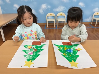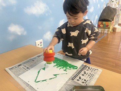 制作では、クリスマスツリーを絵の具スタンプで