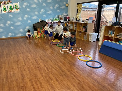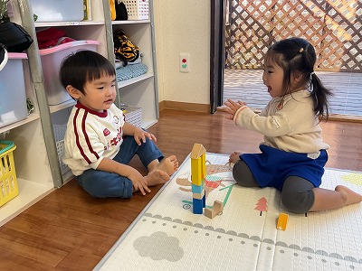 室内では、ままごとや積み木・シャボン玉遊びも