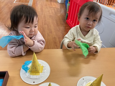 花紙を丸めて貼り、節分の帽子も