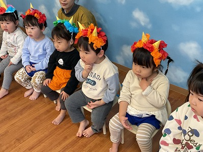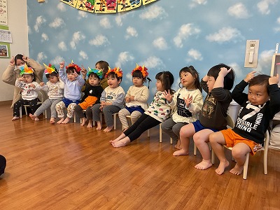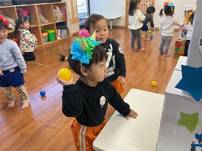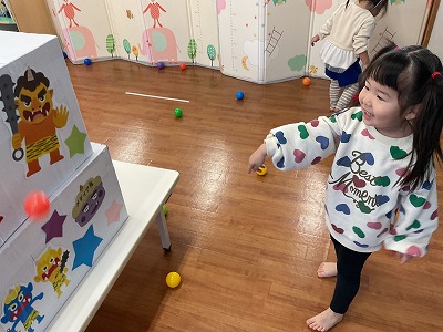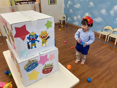 令和8年2月3日 豆まき 『おには~そと!!』 『ふくは~うち!!』 今日は、豆まきに参加しました(*^^*) 節分についてのお話や絵本を見たり 元気に「豆まき」の歌を歌いました♬ カラーボールを豆に見立てて 段ボール鬼に投げて退治しましたよ☆彡 みんなのおかげで鬼は逃げていきました! 今年も病気をせずに 元気に過ごせますよ~に♡♡