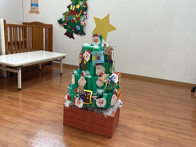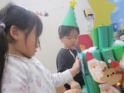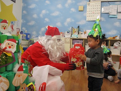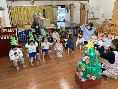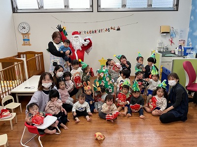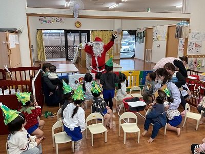 令和7年12月24日 クリスマス会🎄 今日は待ちに待ったクリスマス会☆ 各クラスで作った帽子を付けて参加しました♬ 最初はシルエットクイズに挑戦! 何が出てくるかな~? 次にツリーの飾り付けをしました! みんな好きな所に飾り付けしてくれましたよ(*^^*) “あわてんぼうのサンタクロース”を歌い終わると なんと!サンタさんが!! みらい保育園にも来てくれました🎅 そして、プレゼントをもらいました🎁 最後はみんなで記念撮影♬ 楽しいクリスマス会になりました🎄