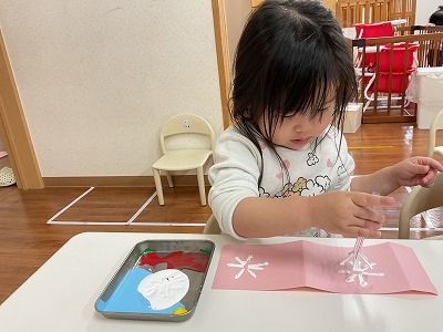洗濯バサミを使った指先の遊びも集中して