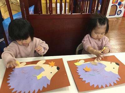 今月の制作では、秋の木の実シール貼りと