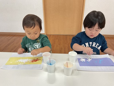 制作遊びでは、障子紙を使って染め紙をして