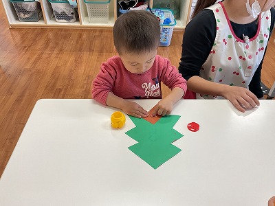 ペタペタしてツリーの形を作りました🎄✨