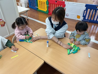 ペタペタしてツリーの形を作りました🎄✨