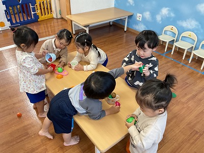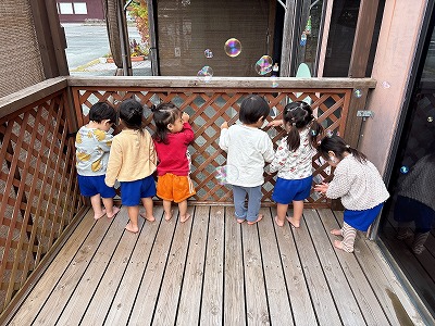 室内では、ままごとや積み木・シャボン玉遊びも