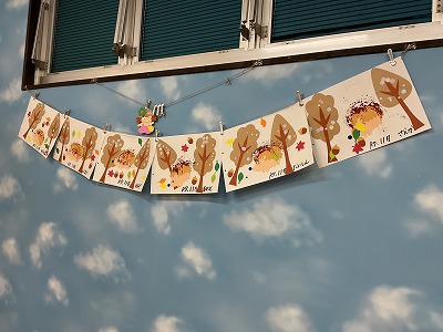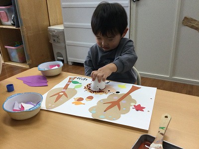 今月の制作では、秋の木の実シール貼りと