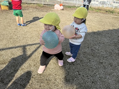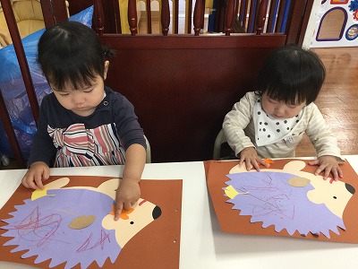 令和7年12月3日 ひよこ組🐣 11月のひよこ組の様子をお伝えします♪ 過ごしやすい気候になり、戸外での活動が たくさんでき大喜びの子ども達(*^^*) 「お外行くよー!」の声で帽子を取りに来てくれます♡ お散歩や園庭遊びを楽しんでいます♬ お兄さんお姉さんたちと遊ぶのも大好きです❤ お部屋の中では、鏡を見つけて覗いたり いろんなおもちゃに興味を持ってくれます! 手作り玩具のぽっとん落としは特に大人気です😄 制作では、絵の具やクレヨンをしました。 葉っぱを最後に貼り、、、 かわいいハリネズミができました🦔