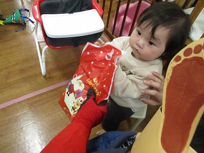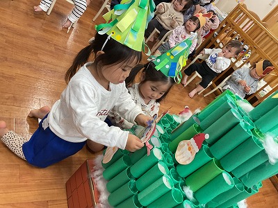 令和7年12月24日 クリスマス会🎄 今日は待ちに待ったクリスマス会☆ 各クラスで作った帽子を付けて参加しました♬ 最初はシルエットクイズに挑戦! 何が出てくるかな~? 次にツリーの飾り付けをしました! みんな好きな所に飾り付けしてくれましたよ(*^^*) “あわてんぼうのサンタクロース”を歌い終わると なんと!サンタさんが!! みらい保育園にも来てくれました🎅 そして、プレゼントをもらいました🎁 最後はみんなで記念撮影♬ 楽しいクリスマス会になりました🎄