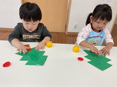 制作では、クリスマスツリーを絵の具スタンプで