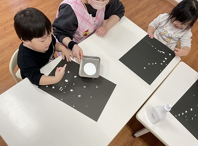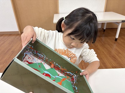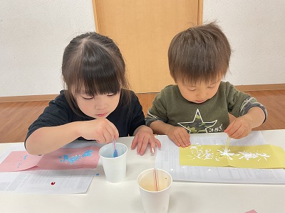 制作遊びでは、障子紙を使って染め紙をして