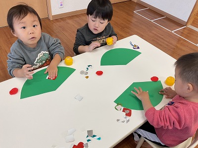 ペタペタしてツリーの形を作りました🎄✨